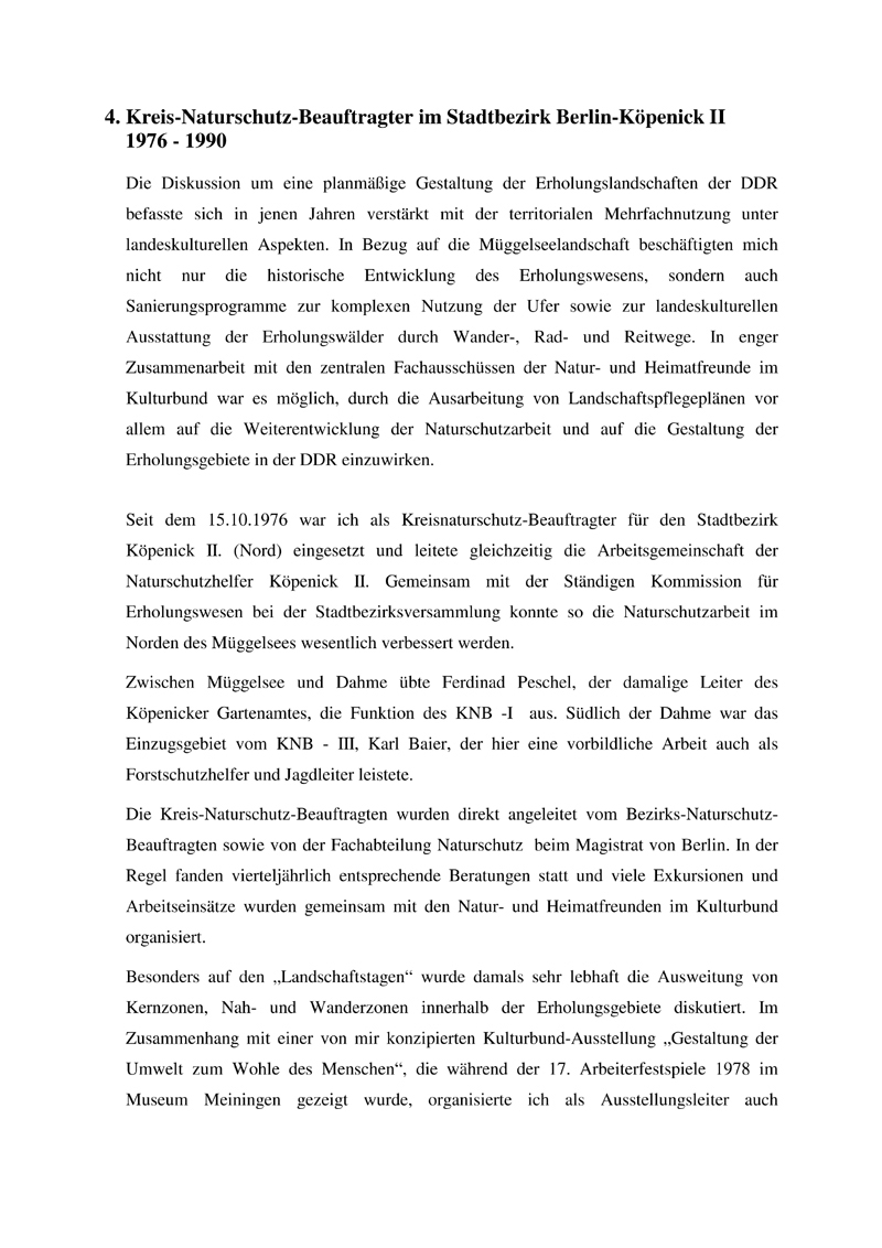 EH zieht ein Resümee seiner Arbeit als "Kreis- Naturschutz- Beauftragter im Stadtbezirk Berlin-Köpenick II 1976-1990" und listet seine Veröffentlichungen auf.